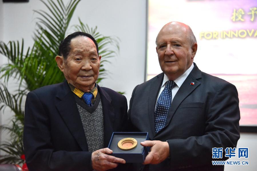 11月16日,智利駐華大使路易斯·施密特·蒙特斯向袁隆平頒發(fā)“中智建交50周年紀(jì)念獎(jiǎng)?wù)?rdquo;。新華社記者 周勉 攝