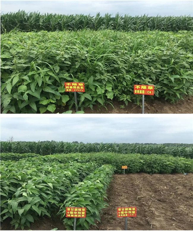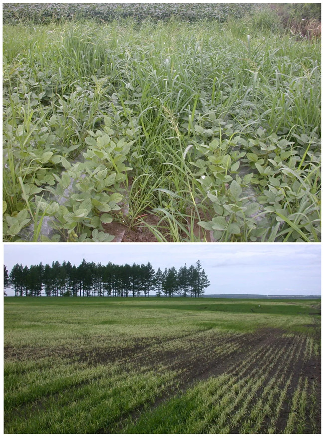 圖1. 大豆田雜草危害(上)及常用除草劑殘留對(duì)后茬作物玉米(下)的危害