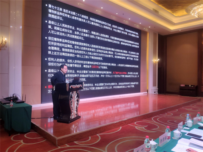 農(nóng)業(yè)農(nóng)村部法規(guī)司執(zhí)法監(jiān)督處張國(guó)橋同志就種子執(zhí)法重點(diǎn)法律條款進(jìn)行解讀。他介紹了農(nóng)業(yè)綜合行政執(zhí)法改革的進(jìn)展情況和重點(diǎn)工作,梳理了種子領(lǐng)域行政執(zhí)法事項(xiàng)和重點(diǎn)領(lǐng)域,詳細(xì)解讀了《種子法》相關(guān)法條。如對(duì)未審先推行為的界定和處罰規(guī)定,省審品種在本省內(nèi)的審定區(qū)域外推廣銷售、在本省外的引種區(qū)域外推廣銷售,都屬于未審先推的處罰范圍;在對(duì)種子銷售行為的認(rèn)定上,以示范用種名義銷售或試驗(yàn)示范用種是有償?shù)?,均屬于種子銷售行為,應(yīng)當(dāng)遵守《種子法》關(guān)于種子銷售的規(guī)定;還有對(duì)無證生產(chǎn)經(jīng)營(yíng)、侵犯植物新品種權(quán)、假冒侵權(quán)品種的認(rèn)定和處罰等。種子執(zhí)法重點(diǎn)法律的解讀不僅加深了種子企業(yè)對(duì)法律的理解,也為種子管理和執(zhí)法提供了指導(dǎo)。