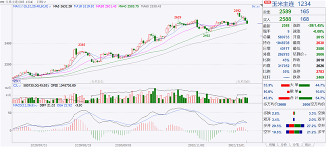 現(xiàn)貨方面,沖高已顯強弩之末。目前吉林最高價已經(jīng)到了2600大關(guān),雖然有不少深加工和烘干塔小幅落價,但從幅度來看明顯在試探上量情況,畢竟?jié)q的時候可是幾分幾分的漲。內(nèi)蒙古扎蘭屯阜豐落10元,14水2470元/噸;遼寧中糧昌圖糧庫落10元,14.5水2530元/噸;嘉吉生化下調(diào)10元/噸,14水2470元/噸,同比上漲810元/噸。中糧公主嶺公司、黃龍公司12月8日7:00新國標三等及以上2530元/噸,四等2510元/噸,四等以下拒收,下跌10元/噸。