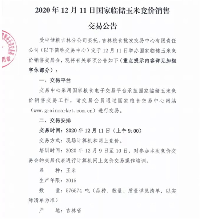 市場晚間最新消息,12月11日國家臨儲玉米競價銷售吉林省2015年玉米576574噸。本次競價交易僅限吉林省內(nèi)規(guī)模以上玉米深加工企業(yè)參與競買,嚴進借用資質(zhì)參與競拍,一經(jīng)發(fā)現(xiàn)可判定買方違約。