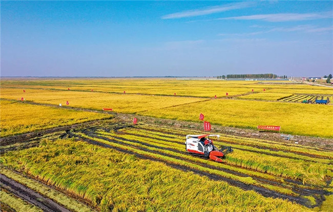 9月27日,農(nóng)民操作機械在興安盟袁隆平院士工作站鹽堿地水稻基地收獲水稻。 徐欽攝