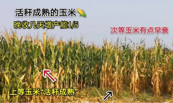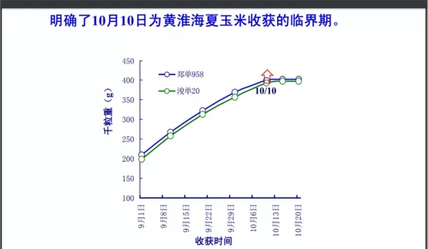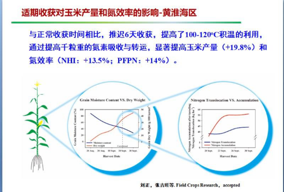 一是山東農(nóng)業(yè)大學劉正博士和張吉旺博士的科研結(jié)果,“活稈成熟”的品種適當晚收獲6天,就可以“白撿”1/5的產(chǎn)量(見附圖,增產(chǎn)率19.8%)。黃淮海區(qū)域的8個省,夏玉米在10月6日~20日之間收獲,千粒重最高。