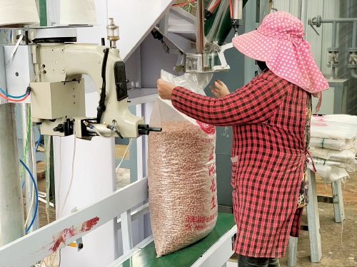 正陽縣新地種植專業(yè)合作社內(nèi),工人正在打包花生米。