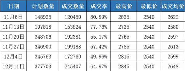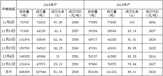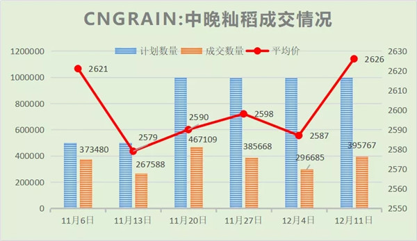 12月11日,安徽省最低收購價中晚秈稻成交量和成交價都大幅回升,最高價2845元/噸為中晚秈稻重啟排賣以來的最高價,均價2648元/噸也為投拍以來新高。