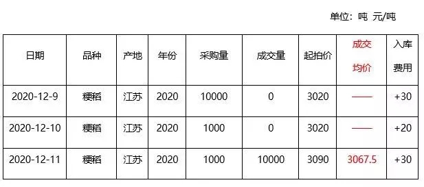 上海糧食交易中心于12月11日下午14點舉行上海市浦東新區(qū)區(qū)級儲備糧網(wǎng)上競價采購交易會,本次計劃采購2020年南方產(chǎn)三等圓粒粳稻谷27150噸,實際成交22150噸,成交率81.58%,最高成交價3060元/噸、最低成交價3055元/噸、成交均價3059元/噸。