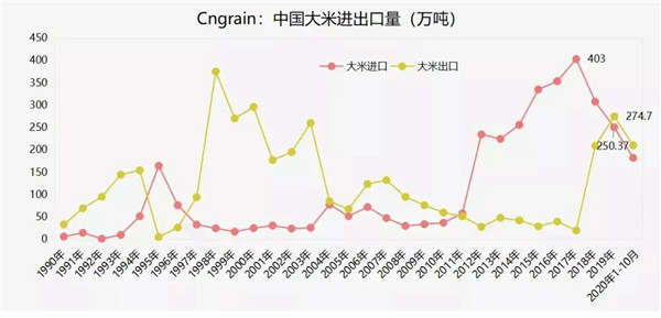 中國(guó)作為世界最大的大米生產(chǎn)國(guó),我國(guó)大米消費(fèi)以國(guó)產(chǎn)米為主,最近幾年進(jìn)口明顯減少,而且出口量正在增加。據(jù)海關(guān)數(shù)據(jù),2019年中國(guó)稻米進(jìn)口量250萬(wàn)噸,出口達(dá)到275萬(wàn)噸,凈出口量25萬(wàn)噸。2020年1-10月我國(guó)累計(jì)進(jìn)口大米181.64萬(wàn)噸,1-10月份我國(guó)累計(jì)出口稻米209.67萬(wàn)噸。