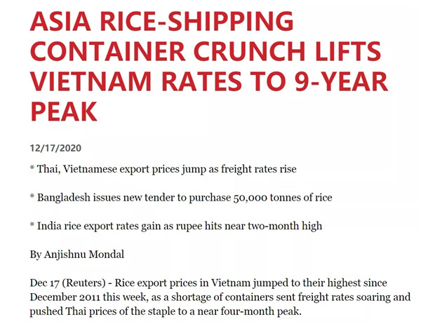 一位貿(mào)易商稱(chēng),集裝箱短缺使得貿(mào)易商很難向客戶(hù)裝運(yùn)大米。例如對(duì)非洲的20英尺集裝箱運(yùn)費(fèi)從數(shù)月前的1500美元漲至5000美元。