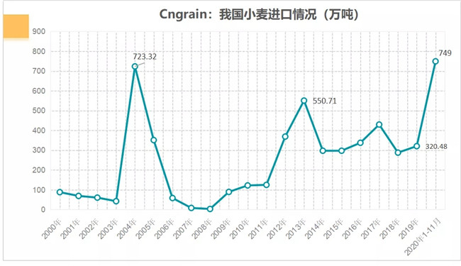 11月份的小麥進口量為80萬噸,同比提高77.8%;1至11月份的進口量為749萬噸,同比提高150.5%。