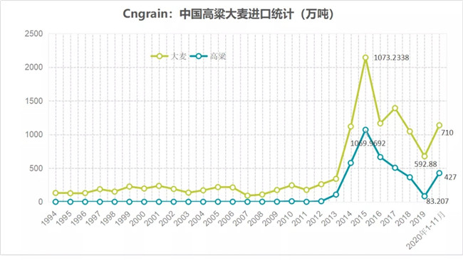 11月份高粱進口量為24萬噸,同比提高300%;1至11月份的進口量為427萬噸,同比提高440.5%。