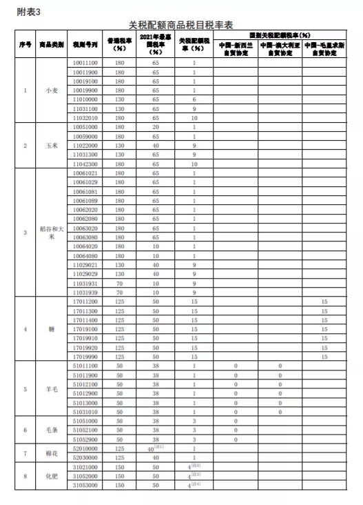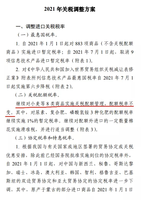 2021年關(guān)稅調(diào)整方案上顯示,從2021年1月1日起調(diào)整部分進(jìn)口商品的最惠國(guó)稅率、協(xié)定稅率和暫定稅率。將繼續(xù)對(duì)小麥等8類商品實(shí)施關(guān)稅配額管理,配額稅率不變。其中,對(duì)尿素、復(fù)合肥、磷酸氫銨3種化肥的配額稅率繼續(xù)實(shí)施1%的暫定稅率。繼續(xù)對(duì)配額外進(jìn)口的一定數(shù)量棉花實(shí)施滑準(zhǔn)稅,并進(jìn)行適當(dāng)調(diào)整。