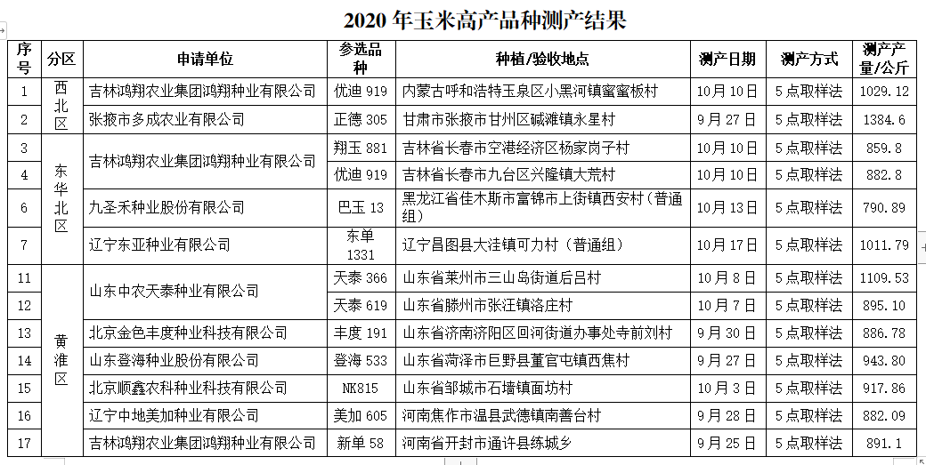 附件:2020年玉米高產(chǎn)品種測(cè)產(chǎn)結(jié)果