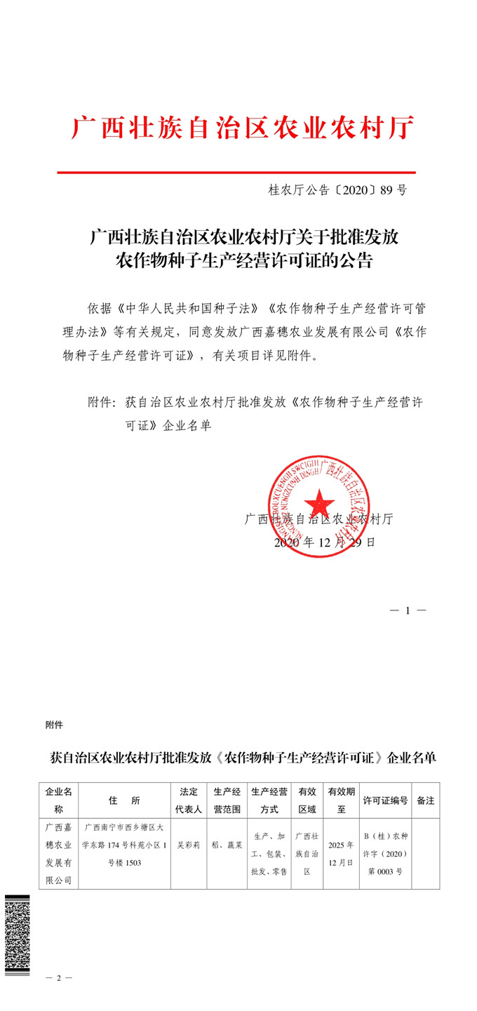 廣西批準(zhǔn)發(fā)放農(nóng)作物種子生產(chǎn)經(jīng)營許可證公告(桂農(nóng)廳公告【2020】89號)