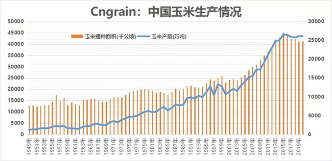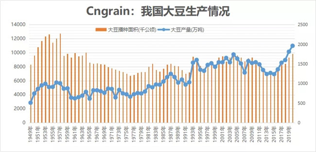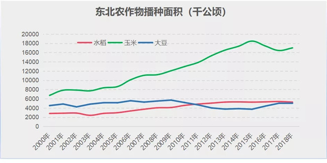 更為棘手的情況則是,玉米和大豆兩個(gè)相對(duì)短缺的品種上,還存在牽制關(guān)系。通過(guò)下面兩張圖表可以發(fā)現(xiàn),玉米大豆兩者在種植方面有很強(qiáng)的的競(jìng)爭(zhēng)性,在2015-2019年玉米播種面積下降的時(shí)候,大豆面積發(fā)生了大幅增漲。