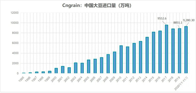 大豆是我國(guó)糧食品種中缺口最大的品種。進(jìn)口的大豆主要用于榨油,滿足食用植物油和豆粕飼料的需求。我國(guó)每年都必須恒定要進(jìn)口8000萬(wàn)噸到9000萬(wàn)噸,而且從長(zhǎng)遠(yuǎn)看,我國(guó)大豆進(jìn)口數(shù)量仍將會(huì)維持在較高水平。
