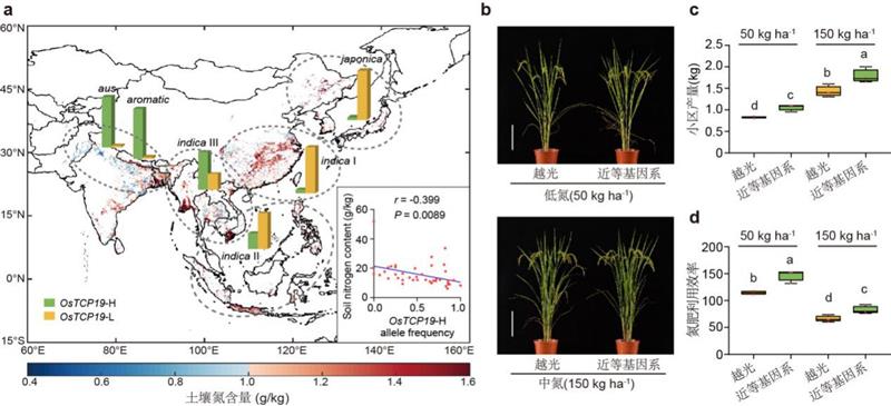長期以來,育種的首要目標是高產(chǎn),使水稻能在大量施用化肥情況下,獲得較高產(chǎn)量。然而,這導致一些重要基因資源的丟失,以致主栽水稻品種肥料利用效率普遍較低。通過對世界水稻種植區(qū)土壤氮含量數(shù)據(jù)分析,研究團隊發(fā)現(xiàn),土壤越貧瘠的地方,OsTCP19氮高效變異越常見,并隨著土壤氮含量的增加,氮高效類型品種逐步減少,而我國現(xiàn)代水稻品種中這一氮高效變異幾乎全部丟失。