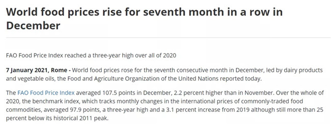 聯(lián)合國(guó)糧農(nóng)組織(FAO)1月7日表示,2020年12月,世界糧食價(jià)格錄得連續(xù)第七個(gè)月上漲,谷物、植物油、乳制品等除糖以外的所有主要類別12月均出現(xiàn)上漲。