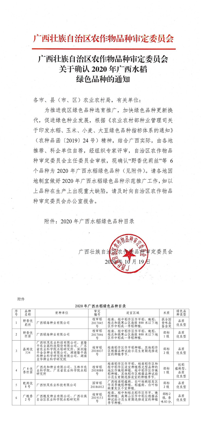 廣西發(fā)布2020年廣西水稻綠色品種確認(rèn)的通知