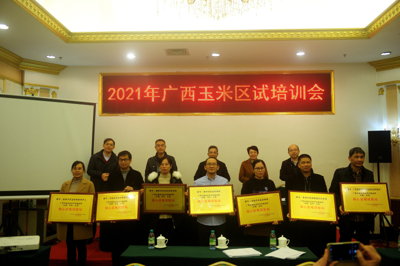 會議還為獲得廣西水稻玉米大豆品種核心區(qū)域試驗(yàn)站的單位頒發(fā)牌扁。