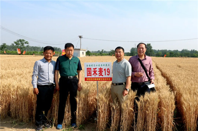 2020年5月,全國(guó)農(nóng)業(yè)技術(shù)推廣中心糧食處處長(zhǎng)呂修濤(右二)、農(nóng)業(yè)農(nóng)村部谷物品質(zhì)監(jiān)督檢驗(yàn)測(cè)試中心(北京)主任王步軍(右一)在王軍(左一)的陪同下考察國(guó)禾麥19田間長(zhǎng)勢(shì)。