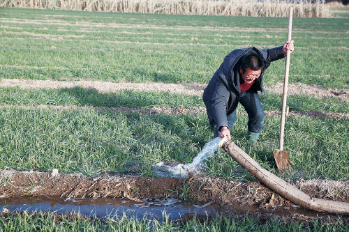 近日,在山西省永濟(jì)市城東街道辦事處趙坊村,農(nóng)民謝春林冒著嚴(yán)寒,在給自家的近2畝干旱十分嚴(yán)重的麥田澆水。