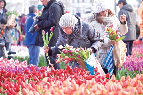 在荷蘭阿姆斯特丹,人們在水壩廣場采摘郁金香?!∥鳡柧S婭·萊德雷爾 攝 新華社發(fā)