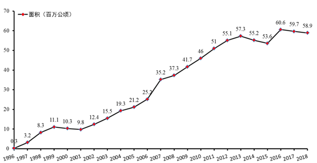 1996—2018年國際轉(zhuǎn)基因玉米種植情況。數(shù)據(jù)來源ISAAA。