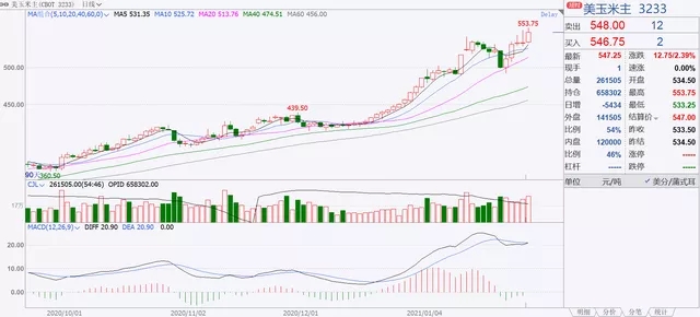 受此影響,芝加哥期貨交易所(CBOT)玉米期貨29日收盤(pán)上漲超過(guò)2%,創(chuàng)下7年多來(lái)的最高水平。盤(pán)中3月期約一度漲至2013年6月份以來(lái)的最高水平553.75美元。從月線(xiàn)圖上來(lái)看,玉米期約上漲63美分或13%,其中包括過(guò)去一周上漲的46.50美分。