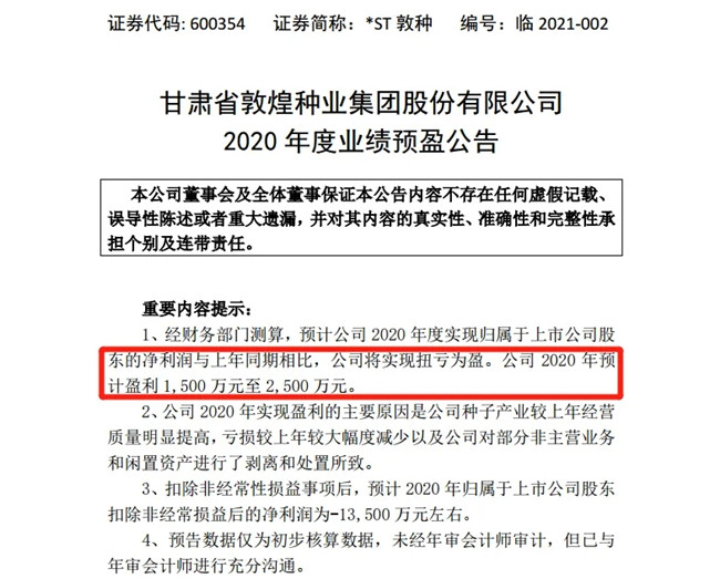 1月28日,甘肅省敦煌種業(yè)集團(tuán)股份有限公司(下稱(chēng)“敦煌種業(yè)”)(600354)公告,預(yù)計(jì)敦煌種業(yè)2020年凈利潤(rùn)與上年同期相比,將實(shí)現(xiàn)扭虧為盈。2020年預(yù)計(jì)盈利1500萬(wàn)元至2500萬(wàn)元。