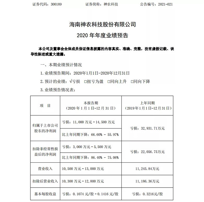 1月29日,海南神農(nóng)科技股份有限公司(以下簡(jiǎn)稱(chēng)“神農(nóng)科技”)發(fā)布業(yè)績(jī)預(yù)告稱(chēng),預(yù)計(jì)2020年凈利潤(rùn)虧損1.1億元至1.45億元,同比下降55.97%至66.60%。