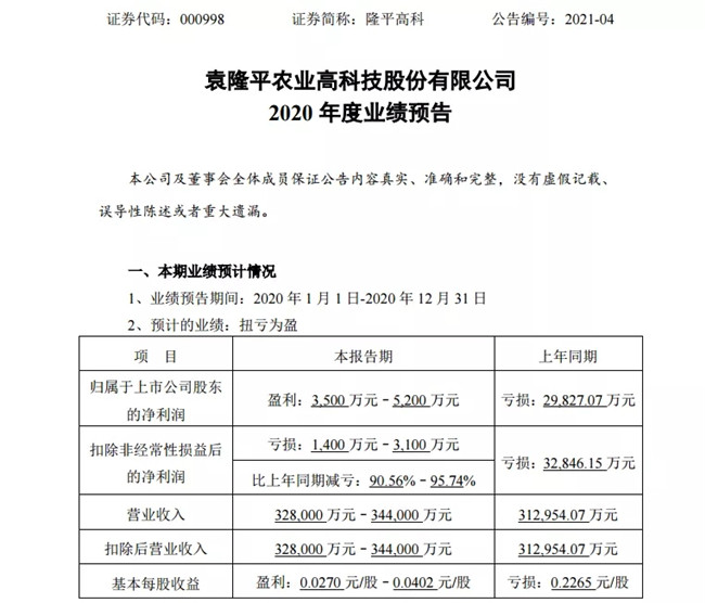 近日,袁隆平農(nóng)業(yè)高科技股份有限公司(下稱(chēng)“隆平高科”)發(fā)布2020年度業(yè)績(jī)預(yù)告,預(yù)計(jì)2020年度凈利潤(rùn)為3500萬(wàn)元-5200萬(wàn)元,上年同期虧損2.98億元,同比增長(zhǎng)111.73%-117.43%,實(shí)現(xiàn)扭虧為盈;扣除非經(jīng)常性損益后的凈利潤(rùn)為虧損1400萬(wàn)元-3100萬(wàn)元,上年同期則為虧損3.28億元。