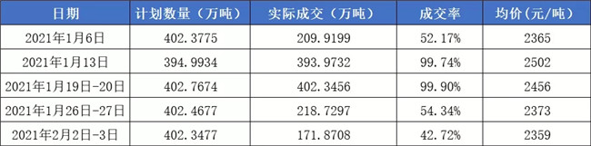 2月2日-3日,小麥拍賣總投放量402.35萬噸,成交量171.87萬噸,成交率42.72%,均價2359元/噸,低于上期的2373元/噸。