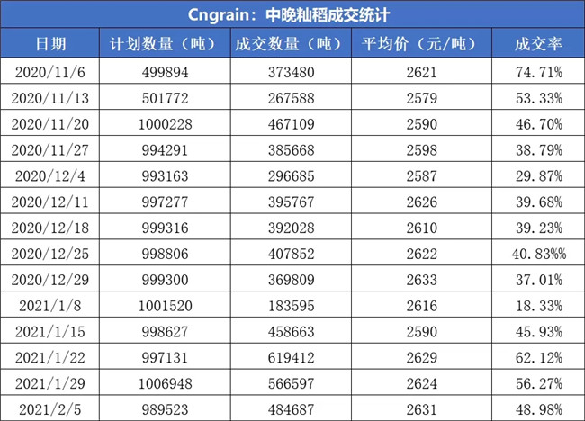 2月份以來國內(nèi)秈米價格逐漸趨于穩(wěn)定,市場需求方面開始放緩。對于節(jié)后工廠挺價心理較強,主要是原糧成本方面。2月5日最低收購價中晚秈稻計劃銷售98.95萬噸左右,實際成交48.47萬噸,成交率49%(上周56%),最高成交價湖北19年三等中晚秈稻3055元/噸,成交均價26231元/噸(上期2624)。安徽2019年二等中晚秈稻最高成交價3045元/噸。湖北最高成交價3055元/噸,為中晚秈稻重啟拍賣以來的第三新高(11月20日3130元/噸、1月22日3075元/噸)。