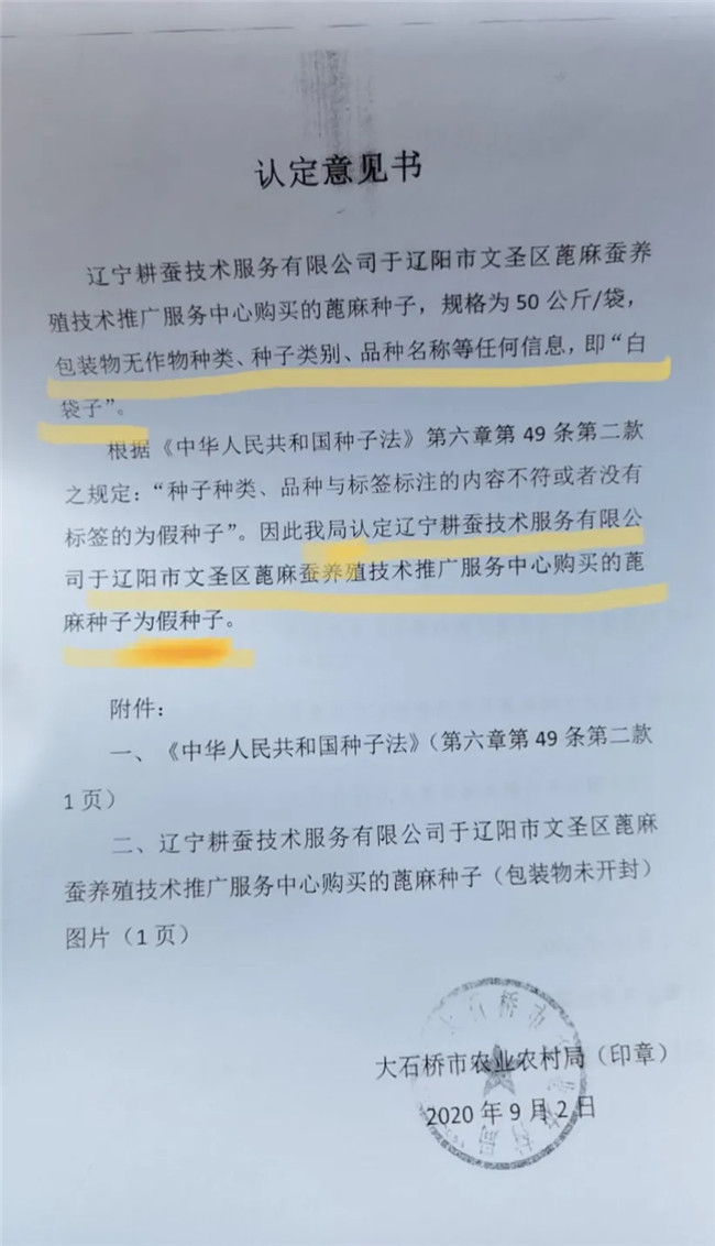 當(dāng)?shù)剞r(nóng)業(yè)農(nóng)村局出具的假種子《認(rèn)定意見書》