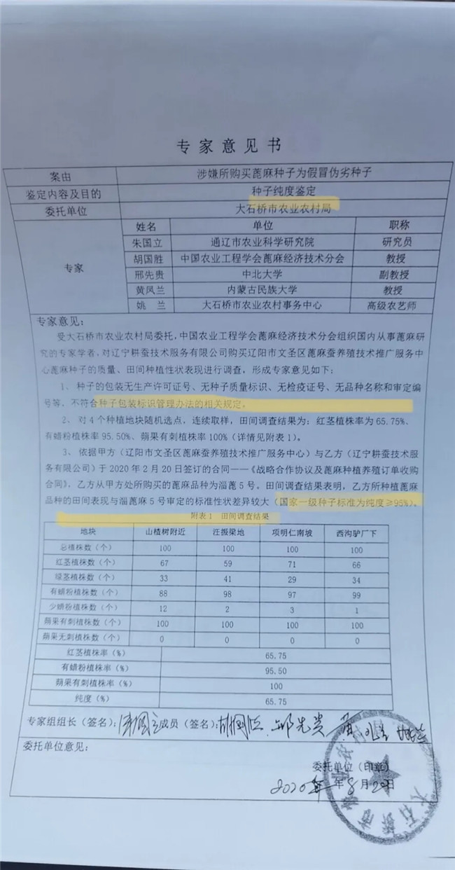 專家組對假種子純度及產(chǎn)量田間測定的鑒定意見