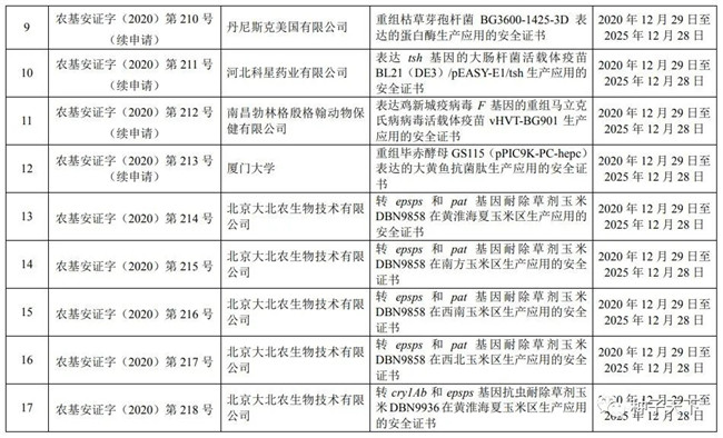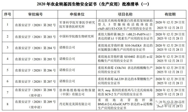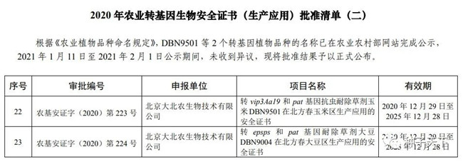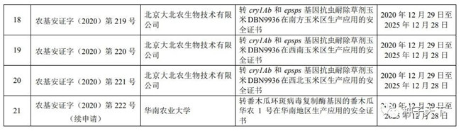 2021年2月4日,農(nóng)業(yè)農(nóng)村部科技教育司正式公布2020年轉(zhuǎn)基因生物安全證書批準(zhǔn)清單。