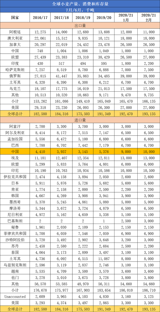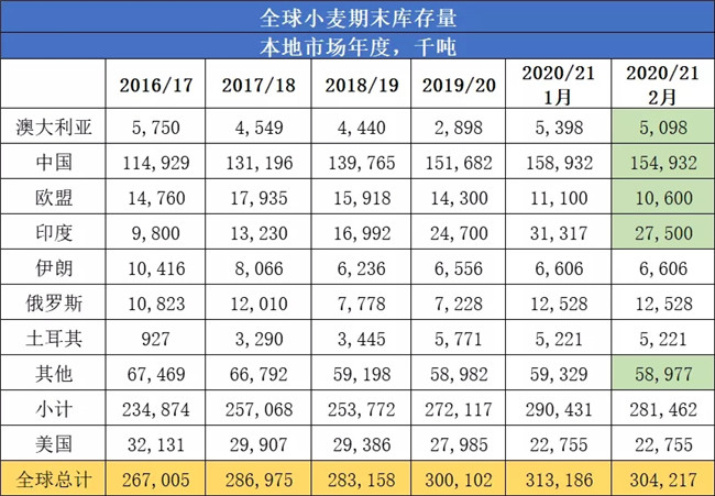 根據(jù)美國(guó)農(nóng)業(yè)部的報(bào)告,2020/21年度全球小麥庫(kù)存從此前的預(yù)估大幅削減約900萬(wàn)噸,至3.0422億噸。