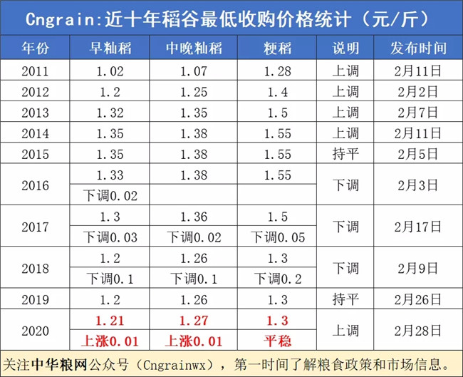 我國稻谷市場(chǎng)“政策市”特征明顯,最低收購價(jià)政策對(duì)水稻種植面積調(diào)整和未來行情走勢(shì)影響很大。根據(jù)歷年來稻谷最低收購價(jià)發(fā)布時(shí)間來看,2月份是我國稻谷最低收購價(jià)政策發(fā)布的窗口期,不過2021年政策出臺(tái)時(shí)間很可能要到2月下旬了。