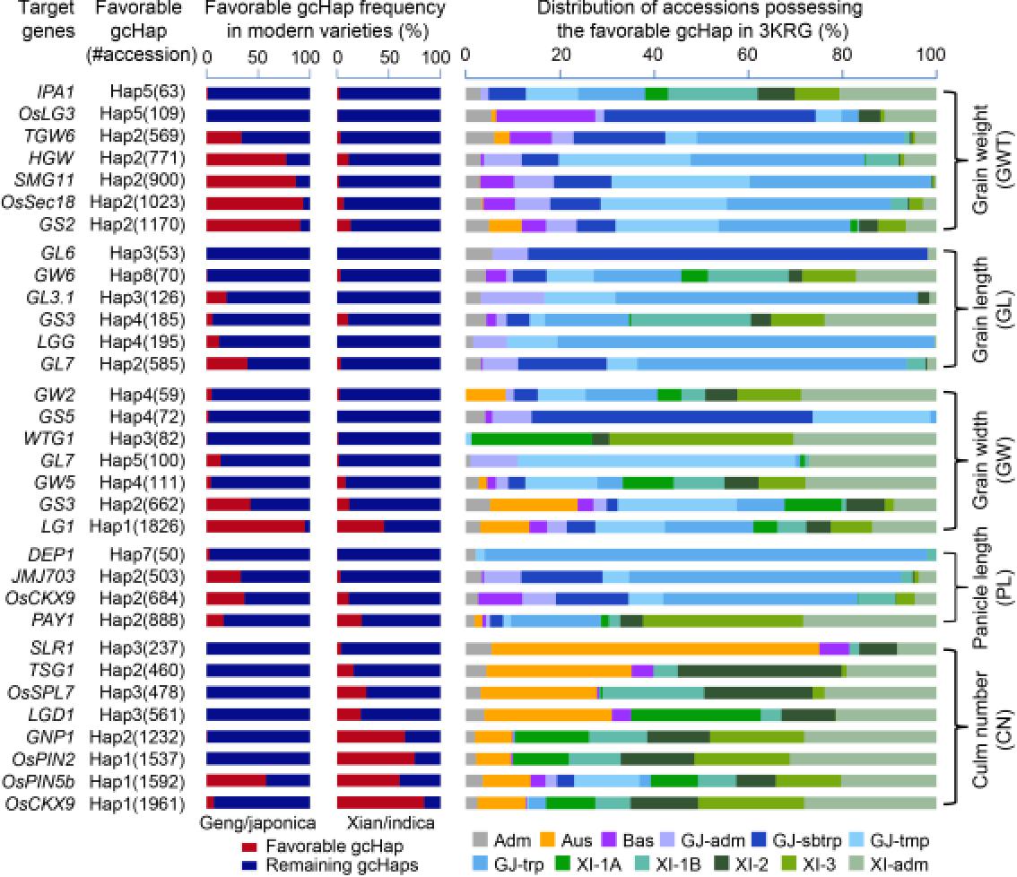 產(chǎn)量相關(guān)基因“有利”gcHap在秈粳育成品種中的頻率及其在種質(zhì)資源中的分布(中國農(nóng)科院供圖)