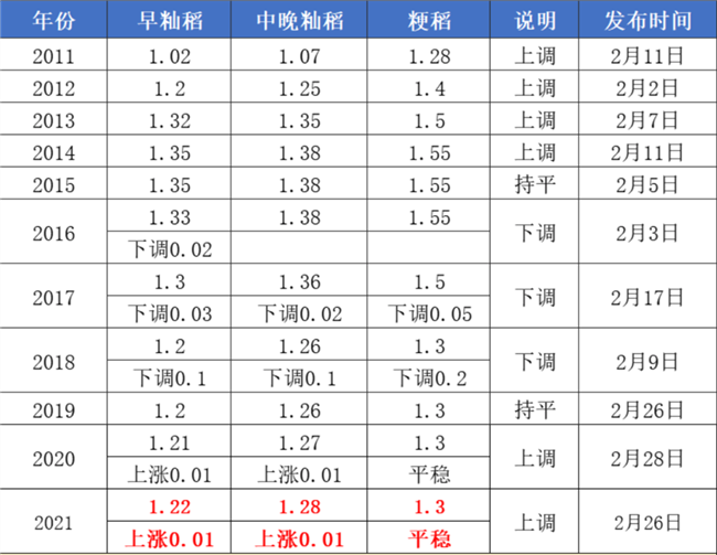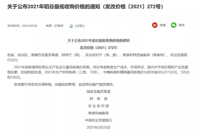 關(guān)于2021年稻谷最低收購價有關(guān)政策的通知