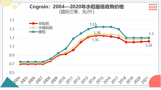 2月26日,國家發(fā)改委公布,2021年生產(chǎn)的早秈稻(三等,下同)、中晚秈稻和粳稻最低收購價(jià)分別為每50公斤122元、128元和130元。與上年相比,早秈稻、中晚秈稻價(jià)格均上漲1分/斤,粳稻價(jià)格連續(xù)4年持穩(wěn)。2020年開始稻谷的托市價(jià)格已經(jīng)從前幾年稻谷收購市場(chǎng)最有競(jìng)爭(zhēng)力的價(jià)格變成“保底價(jià)”,2021年這一市場(chǎng)形勢(shì)繼續(xù)延續(xù)和強(qiáng)化。