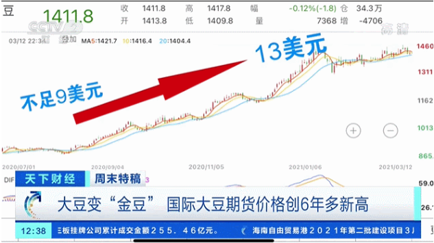 目前,美國芝加哥商品交易所大豆主力合約盤中最高達到每蒲式耳14.6美元,為2014年6月以來交投最活躍大豆合約的最高水平。大豆價格上漲并不是突然出現(xiàn)的,從去年下半年以來,芝商所大豆期貨價格便進入了上升通道,價格從6月底的每蒲式耳不足9美元,漲到年底的13美元,今年以來大豆價格一直保持高位運行。