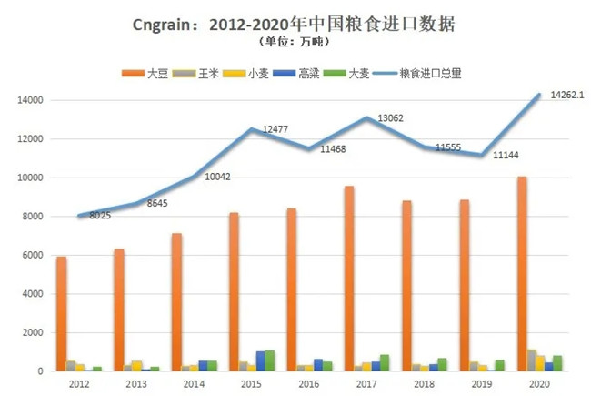 此外,我國以玉米為代表的飼料糧進(jìn)口正在大幅增加。2020年我國糧食進(jìn)口創(chuàng)歷史新高,累計進(jìn)口超1.4億噸,其中將近80%的農(nóng)產(chǎn)品進(jìn)口用于發(fā)展養(yǎng)殖業(yè)的飼料。進(jìn)口規(guī)模最大的三個品種分別是大豆1億噸、玉米1130萬噸、小麥838萬噸,玉米和小麥突出增長,分別為135%、140.2%。