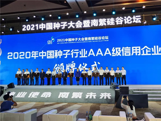 中國種子協(xié)會向“2020年中國種子行業(yè)AAA級信用企業(yè)”頒發(fā)牌匾。