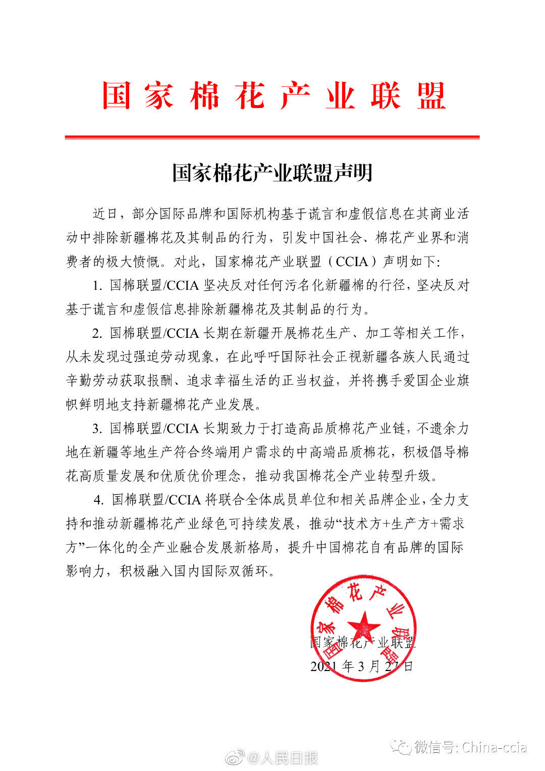 國(guó)家棉花產(chǎn)業(yè)聯(lián)盟發(fā)布聲明【 國(guó)棉聯(lián)盟稱將提升中國(guó)棉花國(guó)際影響力】3月27日,國(guó)家棉花產(chǎn)業(yè)聯(lián)盟發(fā)布聲明:國(guó)棉聯(lián)盟/CCIA堅(jiān)決反對(duì)污名化新疆棉行徑,將聯(lián)合全體成員單位和相關(guān)品牌企業(yè),全力支持和推動(dòng)新疆棉花產(chǎn)業(yè)綠色可持續(xù)發(fā)展,提升中國(guó)棉花自有品牌的國(guó)際影響力。