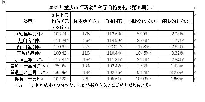 據(jù)全市25個種子市場觀察點統(tǒng)計顯示,截止目前,全市“兩雜”種子銷售除武陵山區(qū)外,已基本結(jié)束。與去年同期相比,水稻、玉米種子總體均價都有所上漲;與3月上旬相比,水稻種子總體均價略降,普通玉米種子總體均價略漲。
