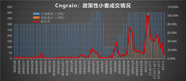 4月14日最低收購價小麥底價上調(diào)60元/噸后的首場拍賣,計劃投放401.57萬噸,實際成交41萬噸,周比減少10萬噸,成交率10.23%,均價2401元/噸,周比增加52元/噸。