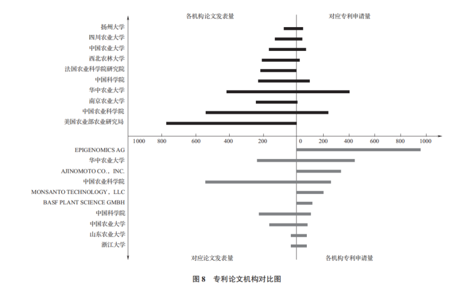 將分子標(biāo)記輔助育種的論文發(fā)表量和專利申請(qǐng)量對(duì)比分析發(fā)現(xiàn),代表基礎(chǔ)研究的高校、科研院所和代表技術(shù)創(chuàng)新應(yīng)用的企業(yè)在兩類知識(shí)產(chǎn)權(quán)產(chǎn)出方面有顯著差異。對(duì)論文發(fā)表量前 10 名的研發(fā)單位統(tǒng)計(jì)發(fā)現(xiàn),其專利申請(qǐng)總量遠(yuǎn)低于論文發(fā)表總量(圖 8)。其中,美國(guó)農(nóng)業(yè)部農(nóng)業(yè)研究局發(fā)表 775篇論文,位于第一,無(wú)專利申請(qǐng);排名第二的中國(guó)農(nóng)業(yè)科學(xué)院發(fā)表 540 篇論文,其專利申請(qǐng)量亦低于論文發(fā)表量。對(duì)專利申請(qǐng)量前 10 名的研發(fā)單位統(tǒng)計(jì)發(fā)現(xiàn),其論文發(fā)表總量遠(yuǎn)低于專利申請(qǐng)總量,前 6家研發(fā)機(jī)構(gòu)中,企業(yè)占 4 家。其中,EPIGENOMICS AG 專利申請(qǐng)量位于第一,共申請(qǐng) 922 件專利,但無(wú)論文發(fā)表;華中農(nóng)業(yè)大學(xué)排名第二,申請(qǐng)量為 439件,論文發(fā)表數(shù)量為 230 篇,是該技術(shù)領(lǐng)域基礎(chǔ)研究和技術(shù)創(chuàng)新并舉的研發(fā)機(jī)構(gòu);AJINOMOTO CO.,INC. 排 名 第 三,專 利 數(shù) 量 為 332 件,同 樣 無(wú) 論 文發(fā)表。