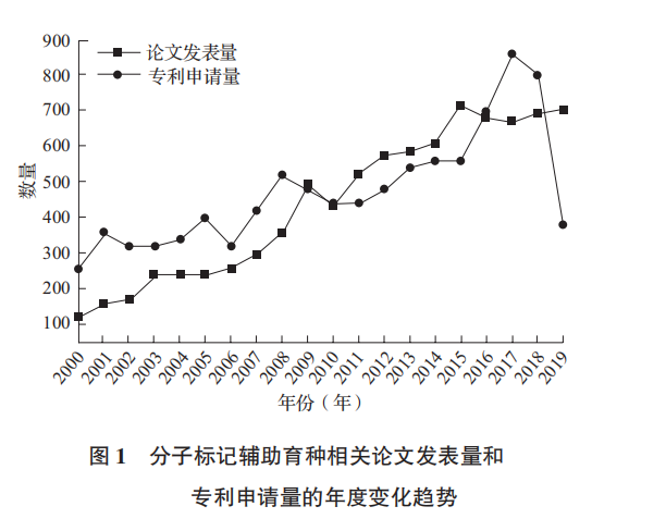 相比于傳統(tǒng)育種,分子標(biāo)記輔助育種不僅可以極大地縮短育種年限,提高育種效率,節(jié)約大量的人力、物力,且不受時(shí)間和環(huán)境限制,還可對(duì)不同階段及多種環(huán)境條件下(溫室、異地等)的樣本進(jìn)行選擇。在論文與專利雙維度視角下,對(duì)分子標(biāo)記輔助育種發(fā)展態(tài)勢(shì)進(jìn)行分析,可以對(duì)其研發(fā)思路、技術(shù)創(chuàng)新和應(yīng)用方向等做出精準(zhǔn)定位。此外,基于多樣的論文和專利數(shù)據(jù)庫(kù)進(jìn)行雙維度分析研究,是目前國(guó)家研發(fā)資源投放和有關(guān)部門(mén)進(jìn)行戰(zhàn)略部署的重要依據(jù)。