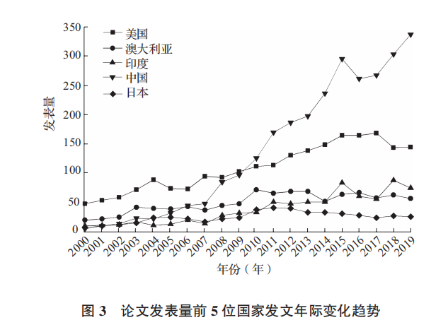 由 圖 3 可以看出,2000-2019 年,排名第一的中國(guó)論文發(fā)表數(shù)量總體呈現(xiàn)上升趨勢(shì),2000-2007 年呈現(xiàn)平緩上升狀態(tài),2007-2015 年連年快速上升,并在 2010 年超越美國(guó),成為論文發(fā)表數(shù)量最多的國(guó)家。緊隨其后的美國(guó)是起點(diǎn)最高的國(guó)家,在 2000-2009 年是論文發(fā)表數(shù)量最多的國(guó)家,論文發(fā)表數(shù)量在波動(dòng)中緩慢上升。印度的論文發(fā)表數(shù)量發(fā)展趨勢(shì)與美國(guó)類似,在 2014 年超過(guò)澳大利亞,成為論文發(fā)表數(shù)量排名第三的國(guó)家。排名第四的澳大利亞論文發(fā)表數(shù)量時(shí)而上升時(shí)而下降,波動(dòng)平緩,但總體變化量不大。排名第五的日本論文發(fā)表數(shù)量變化也比較平緩,且自 2011 年開(kāi)始有緩慢下降的趨勢(shì)。可見(jiàn)自2007 年之后,中國(guó)在該領(lǐng)域發(fā)展態(tài)勢(shì)強(qiáng)勁,論文發(fā)表數(shù)量在國(guó)際研發(fā)市場(chǎng)處于領(lǐng)先地位。